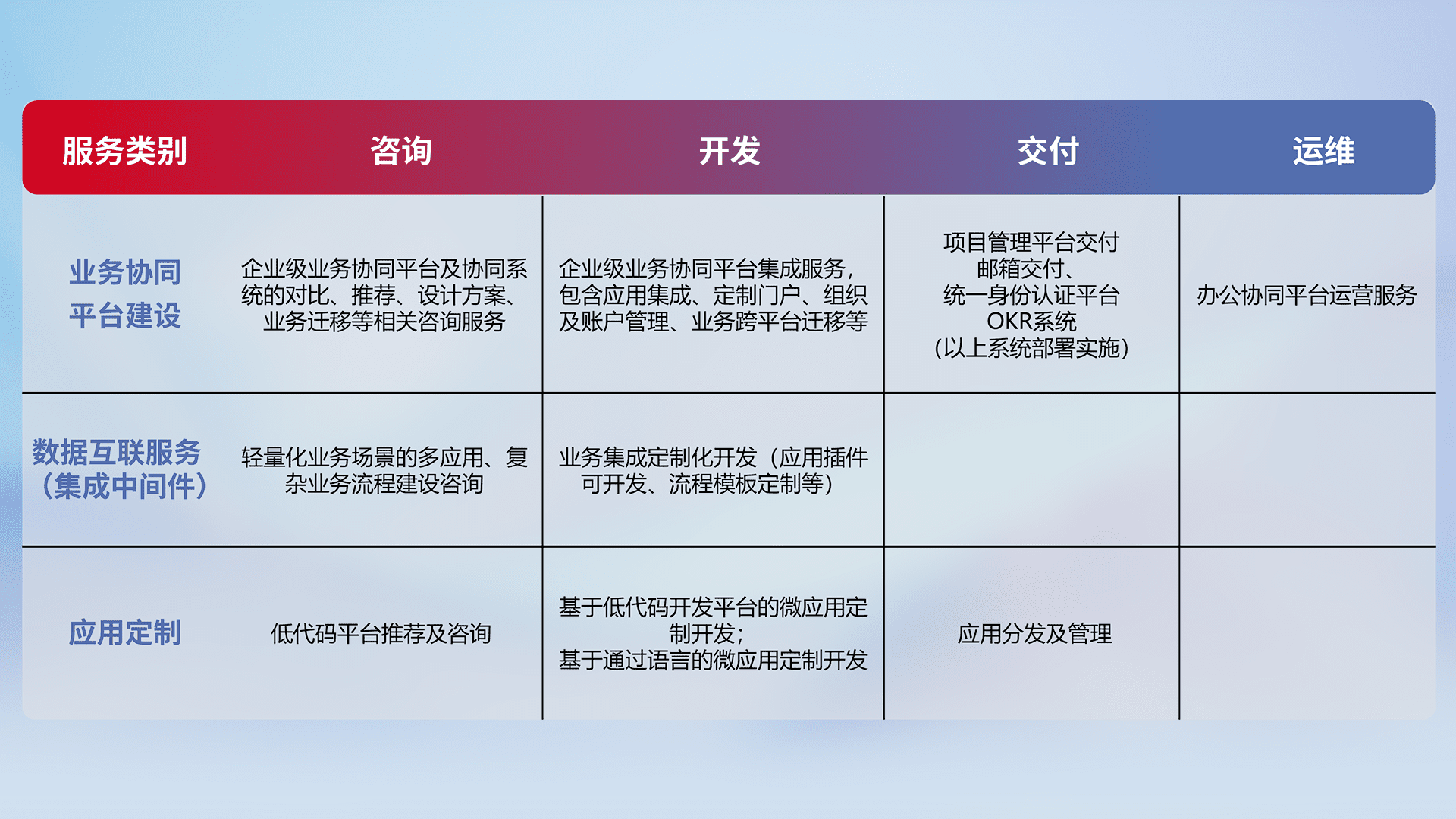针对钉钉、、企微、、、IDaas等平台级产品提供产品的规划、、、、方案、、交付、、定制化开发等服务,,,,实现如统一协同办公、、智能客户服务、、混合会议管理、、智能数据查询、、、、等业务场景,,,实现数字化转型。。